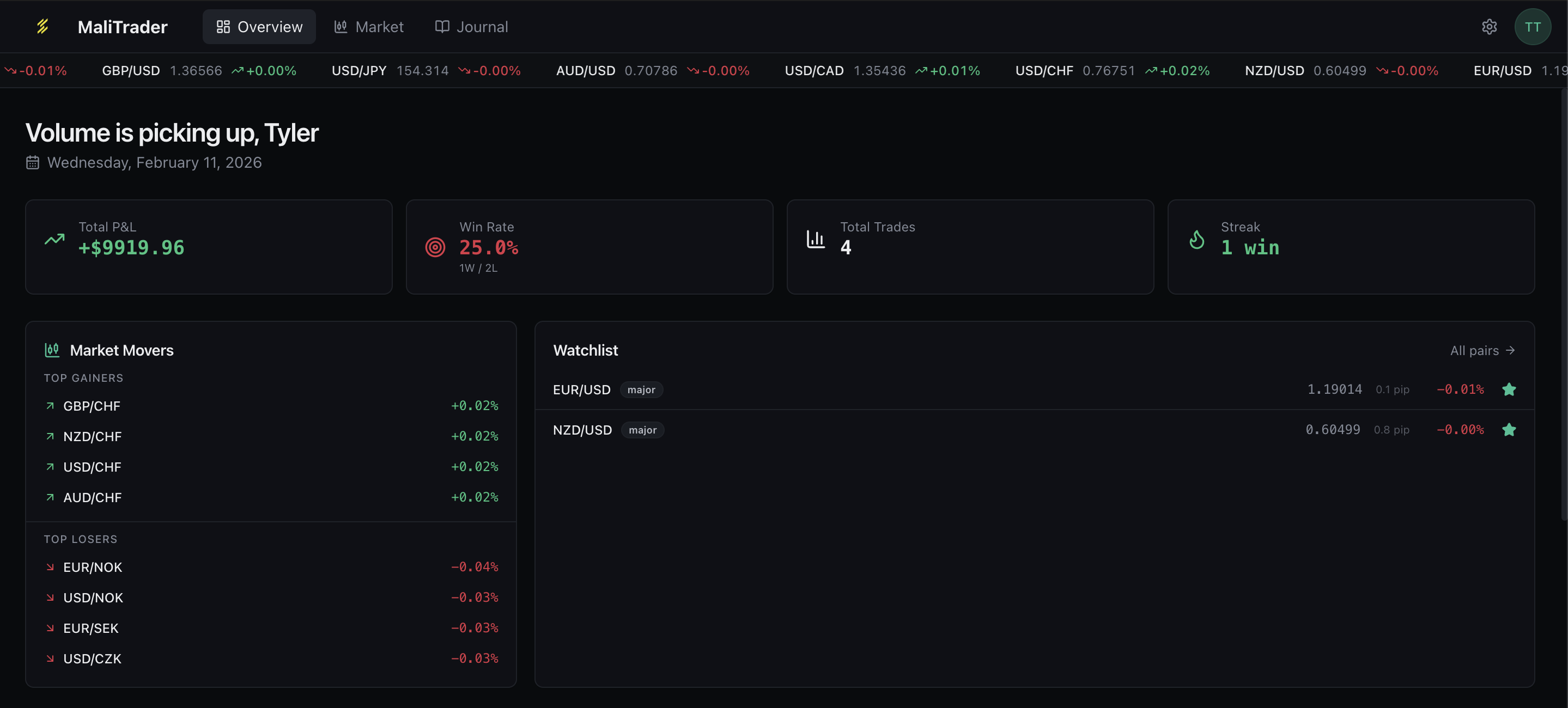 Monitor your open positions with real-time unrealized P&L. When you're ready to exit, close with one click — you'll see your gross P&L, commissions, pip movement, and net result before confirming. The trade is automatically logged to your journal.
